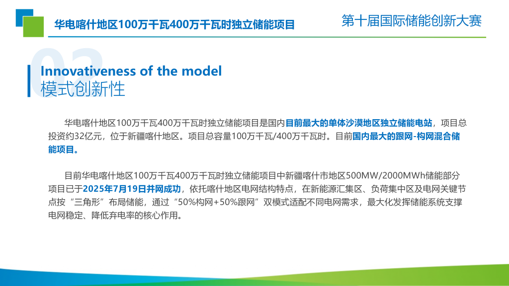 憑借「華電喀什地區 100萬千瓦/400萬千瓦時獨立儲能項目」,獲選2026儲能應用創新典范TOP10,彰顯在大型儲能項目落地應用中的領先實力。