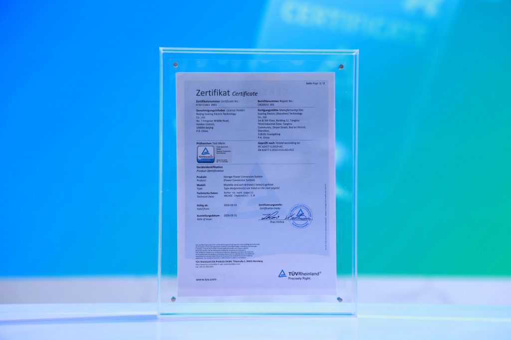 獲得TüV萊茵認證,標志著索英電氣儲能產品獲得全球主流市場準入資格,進一步夯實公司在國際儲能市場的競爭力,為海外業務拓展筑牢信任基石。未來,索英電氣將持續以“技術創新+品質至上”為核心,攜手TüV萊茵等全球權威機構,不斷提升產品合規性與國際競爭力,以中國智造賦能全球儲能產業高質量發展!