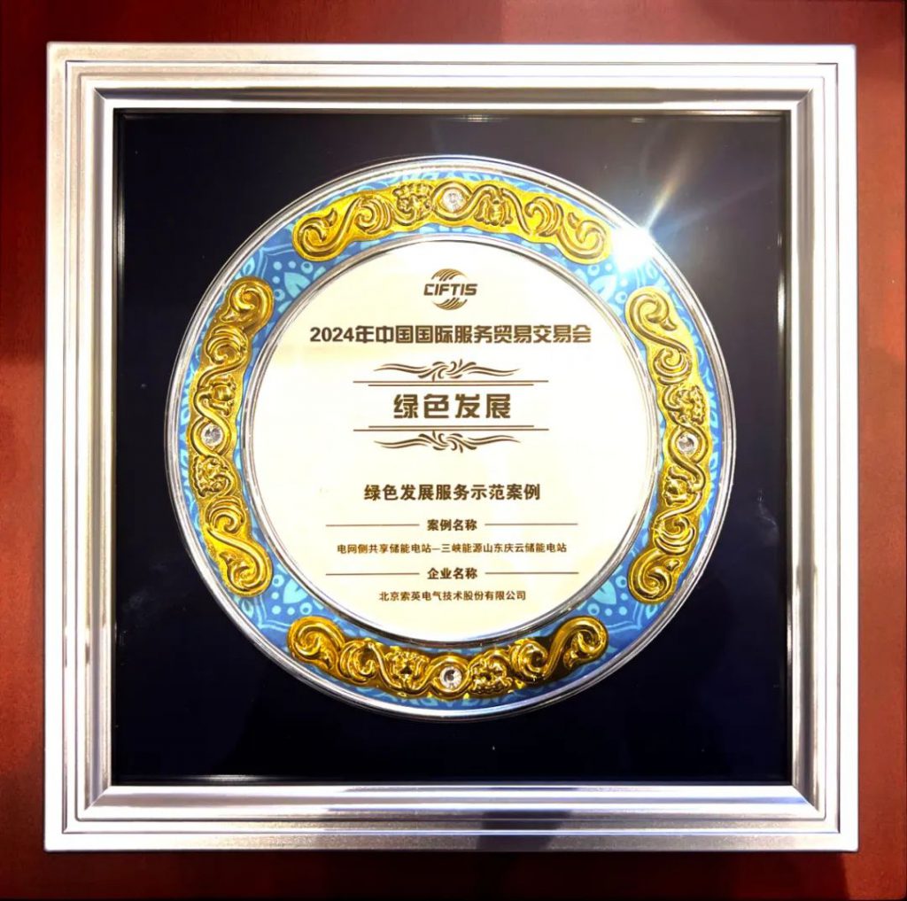 2024年9月15日,由商務部和北京市人民政府共同主辦2024年中國國際服務貿易交易會(服貿會)服務示范案例頒獎典禮在北京國家會議中心順利舉辦,會上正式公布本屆服貿會獲選的100個服務示范案例,索英電氣憑借“電網側共享儲能電站——三峽能源山東慶云儲能電站”項目入選綠色發展服務示范案例。