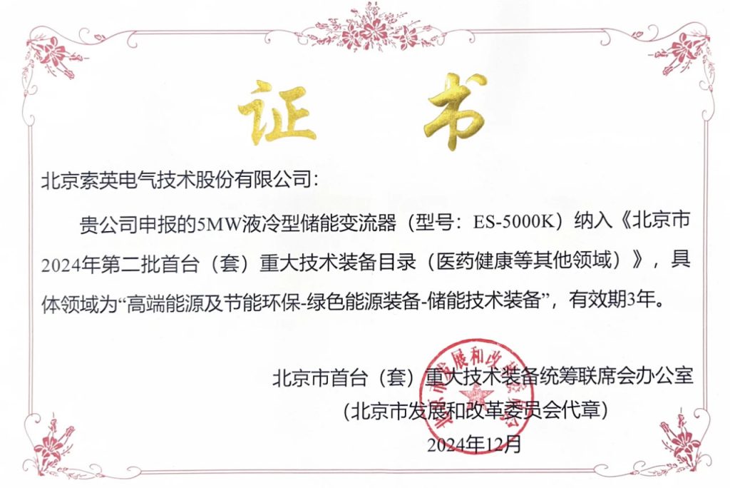 索英電氣5MW液冷型儲能變流器榮登北京市2024年第二批首臺(套)重大技術裝備目錄