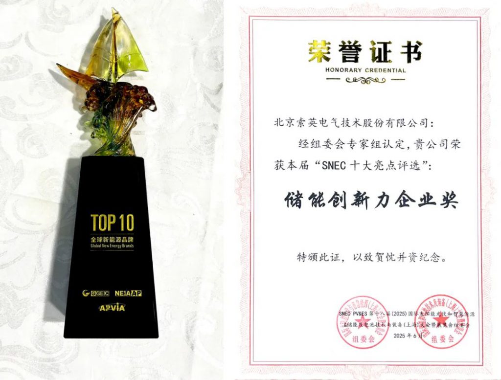 展會同期,索英電氣榮獲主辦單位頒發的“全球新能源品牌”與“儲能創新力企業”兩項大獎。這代表著行業對其在新能源領域品牌影響力及儲能技術創新能力的雙重認可。作為全球能源行業標桿盛會上的重要榮譽,這兩項大獎不僅彰顯了索英電氣在儲能技術、產品解決方案上的領先地位,也體現了其在全球新能源市場中的廣泛影響力和行業高度贊譽。此次獲獎,將進一步激勵索英電氣深化技術研發,推動儲能產業創新升級,為全球能源轉型和零碳未來貢獻更多力量。